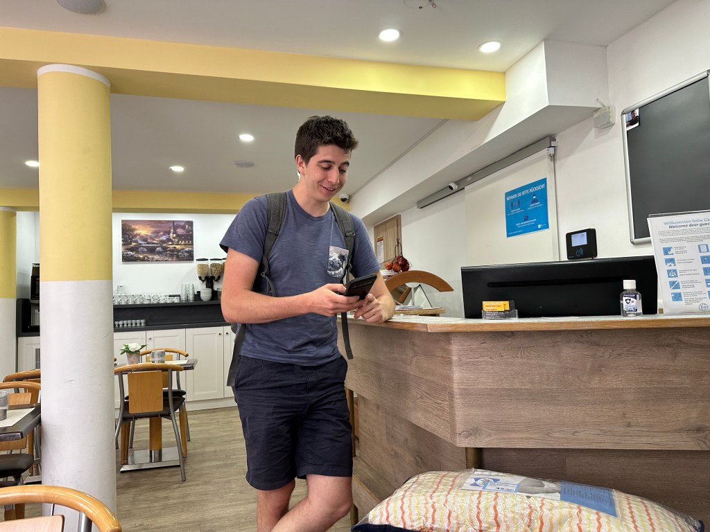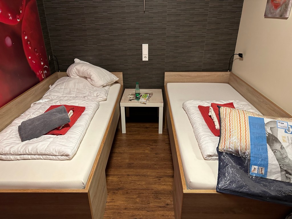 Bon, arrivés dans Fussen, après s’être garé rapidement, nous nous dirigeâmes d’un pas assuré vers l’hôtel, nous passons la porte d’entrée pour découvrir une réception…. Vide… Nico appel le numéro de téléphone noté sur la porte d’entrée et un réceptionniste lui explique qu’il va arriver dans une vingtaine de minutes. Nous attendons donc, et nous comprenons aussi que cette porte d’entrée n’aurait jamais dû être ouverte, mais nous attendons quand même assis a l’intérieur. Une bonne vingtaine de minutes à patiente le tant attendu réceptionniste arrive…… pour nous expliquer que nous n’avons pas de réservation chez eux…. Nous ne sommes pas dans le bon hôtel, le notre se trouve dans une rue adjacente, un hôtel au nom très proche… 🙄🙄🙄🙄🙄🙄🙄🙄