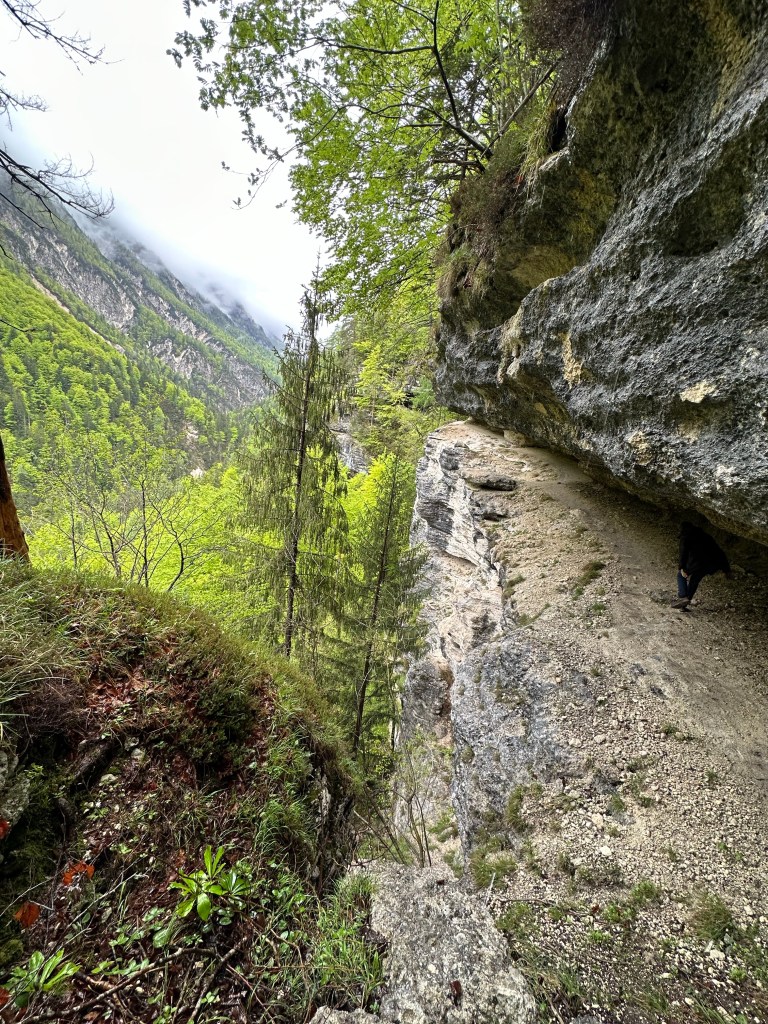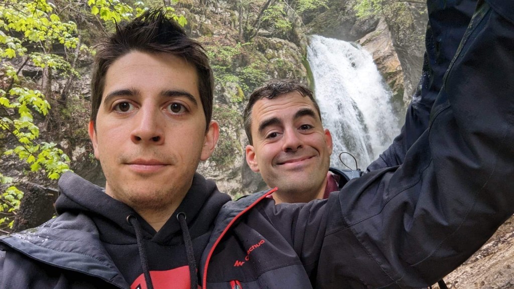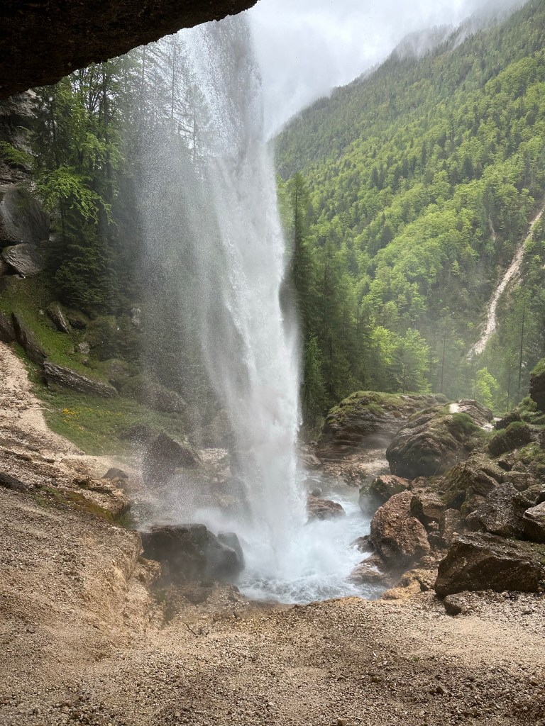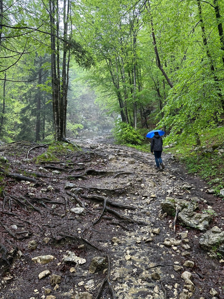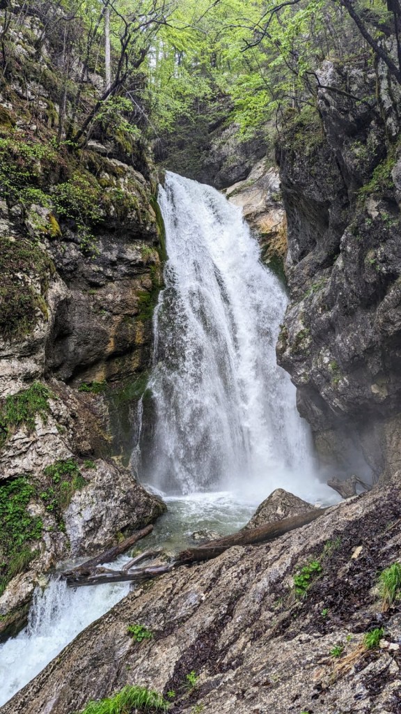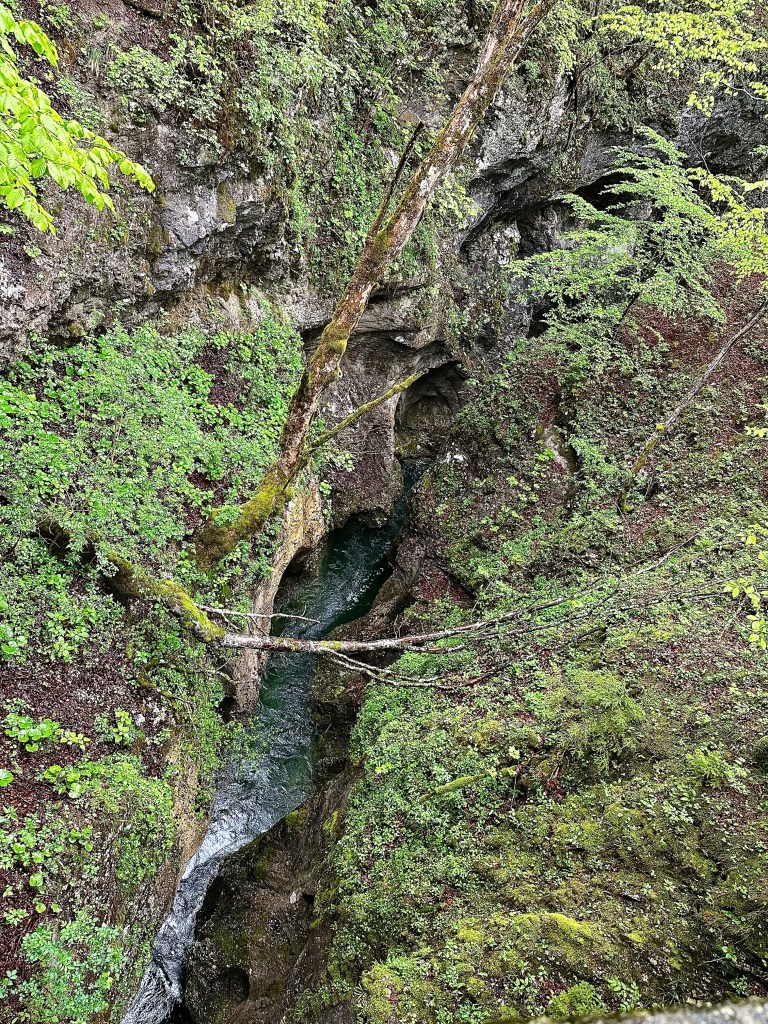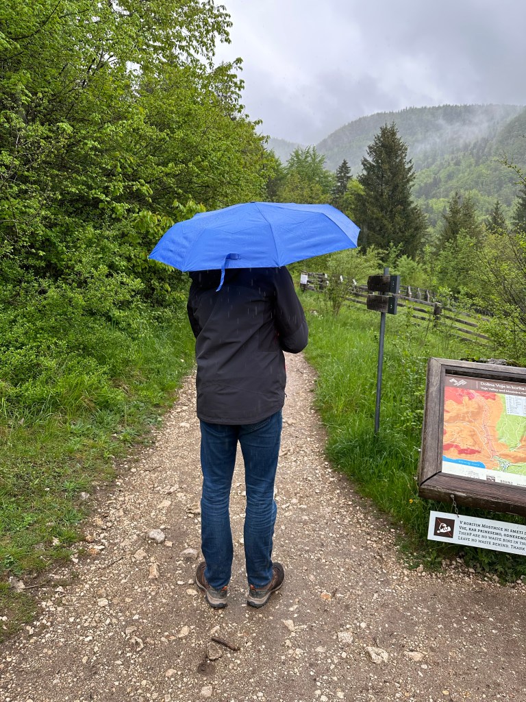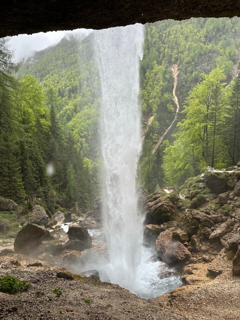 C’est partit pour la MostnicaAprès avoir suivi le cours d’eau on perd le fil et on progresse dans une vallée entourée de montagnes, direction le bout de la vallée vers la chute d’eau principale.Et la pluie… C’est repartit de plus belle On garde le sourire sous la pluie battanteLes bras bien levés maintenant les parapluies pour le pas tomber sous l’eauChute de la MostnicaEt ça repart dans l’autre sens. Incroyable vue.Après avoir déjeuné dehors en profitant d’une accalmie, nous avons roulé environ 1h30 afin de marcher vers les chutes de Pericnik composées d’une grande chute (ci dessus) et d’une petite chute au dessus qui s’écoule au dessus.La grande chute (on pouvait passer derrière c’était stylé)La petite chute d’eau, qui était accessible en montant un peu plus haut.Nous avons ensuite décidé de passer derrière et de continuer sur un sentier creusé dans le flanc de la montagneC’était très impressionnant, pas le droit à l’erreur, on faisait très attention ou l’on mettait les pieds. On était à 1000m d’altitude, à plus de 100m du sol.On a finit par rebrousser chemin, on pensait récupérer un sentier mais le creux dans la montagne semblait continuer très loin dans le sens inverse de notre objectif. Surtout que nous nous étions permis de passer à cet endroit dangereux du fait de l’absence de pluie, mais on savait que des nuages rodaient dans le coin et finissent toujours par arroser rapidement les Slovène.Cette limace était exceptionnelle 😄Petit cours d’eau en revenant du parking, sa couleur était exceptionnellement magnifique Première éclaircie en 5 jours c’était très beau, on s’est garé pour photographier les montagnes Et on finit la journée par une grosse pizza 😋