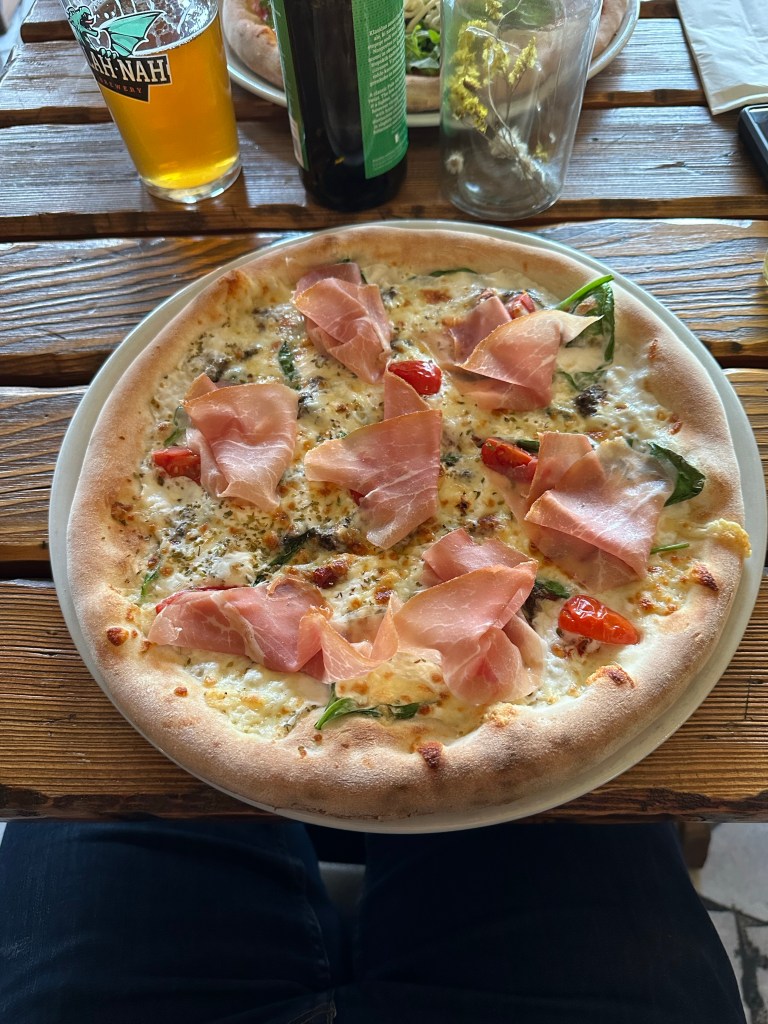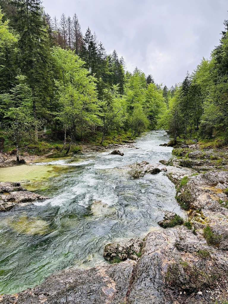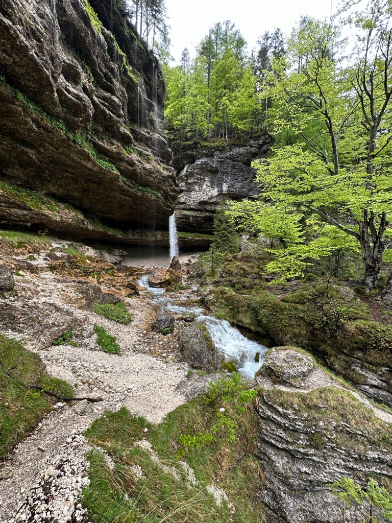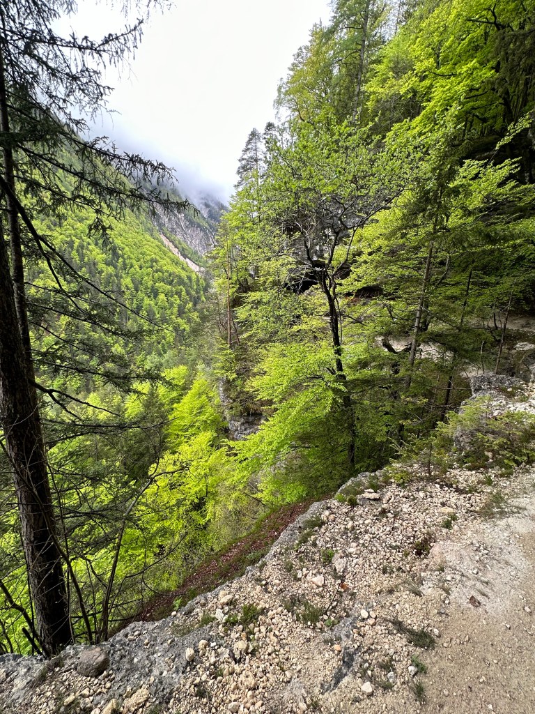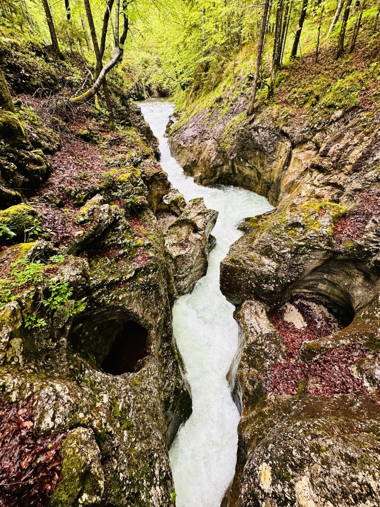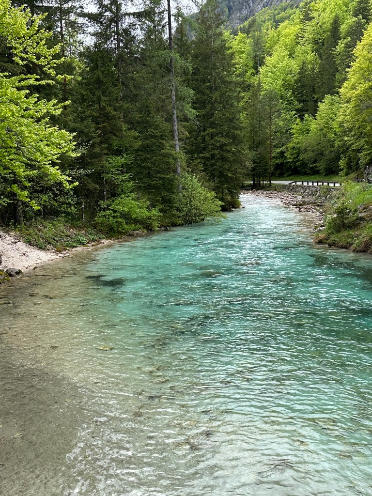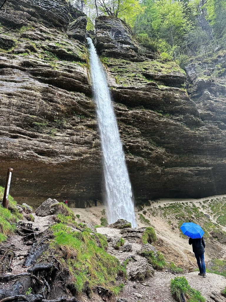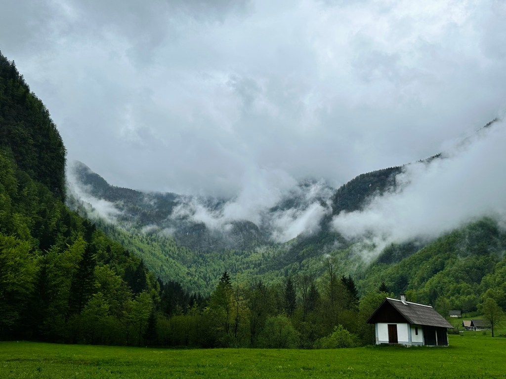 C’est partit pour la MostnicaAprès avoir suivi le cours d’eau on perd le fil et on progresse dans une vallée entourée de montagnes, direction le bout de la vallée vers la chute d’eau principale.Et la pluie… C’est repartit de plus belle On garde le sourire sous la pluie battanteLes bras bien levés maintenant les parapluies pour le pas tomber sous l’eauChute de la MostnicaEt ça repart dans l’autre sens. Incroyable vue.Après avoir déjeuné dehors en profitant d’une accalmie, nous avons roulé environ 1h30 afin de marcher vers les chutes de Pericnik composées d’une grande chute (ci dessus) et d’une petite chute au dessus qui s’écoule au dessus.La grande chute (on pouvait passer derrière c’était stylé)La petite chute d’eau, qui était accessible en montant un peu plus haut.Nous avons ensuite décidé de passer derrière et de continuer sur un sentier creusé dans le flanc de la montagneC’était très impressionnant, pas le droit à l’erreur, on faisait très attention ou l’on mettait les pieds. On était à 1000m d’altitude, à plus de 100m du sol.On a finit par rebrousser chemin, on pensait récupérer un sentier mais le creux dans la montagne semblait continuer très loin dans le sens inverse de notre objectif. Surtout que nous nous étions permis de passer à cet endroit dangereux du fait de l’absence de pluie, mais on savait que des nuages rodaient dans le coin et finissent toujours par arroser rapidement les Slovène.Cette limace était exceptionnelle 😄Petit cours d’eau en revenant du parking, sa couleur était exceptionnellement magnifique Première éclaircie en 5 jours c’était très beau, on s’est garé pour photographier les montagnes Et on finit la journée par une grosse pizza 😋